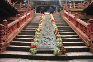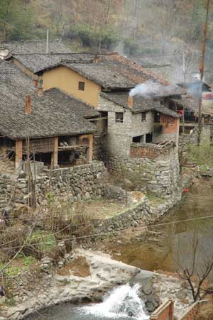 We finished the day following a mountain stream uphill into another beautiful mountain. As we nearly reached the top, there was a chairlift, a range of huge cliffs and some temples. Terry was waiting alone for poor struggling Isa and it did not take long before he was offered food and lodging for the night. A woman had the good idea to bring out a leaflet about the area in English and we decided to spend the night in her house. There was indeed many things to see in the area and we decided to go and explore the temple and garden on top of the cliffs the day after. In the evening, she cooked a lovely meal for us with the local JianMen tofu. Even Terry was forced to admit that the tofu was excellent! |
