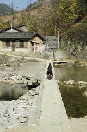 27th November 2005 - Xi'an to Zhouzhi - 74 km We crossed the flat plain leading from Xi'an to the Qinling mountains to the South, once again following again the road G108. The road was busy and we crossed many small towns - all hives of activity. We finally reached the edge of the mountains and we managed to find a camping spot on a small road leading up to a monastery. The road looked quiet, but as Terry checked out the spot, 6 people passed by on bike or by foot. It is difficult to be discreet in China! The only noticeable event of the day was Terry being smacked on the head by a wooden post from a banner above the road. The 2 metre wooden post hit Terry on the head whilst he was checking the map. Luckily Terry's sizeable head resisted the crash thanks to his ever reliable cycling helmet (you never know when it will come in useful).