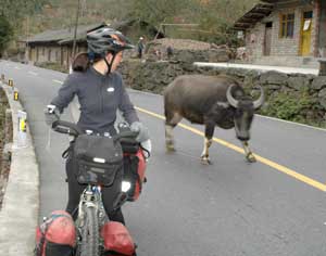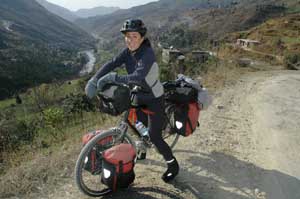 18th November 2005 - Km5 of road 233 to 20km Before Houko Falls - 88km We started the day by completing a long mountain climb up to a picturesque col. Whilst waiting for Isa, Terry was informed in no uncertain terms that we could not descend towards the Houko falls by that route - we must turn round and go back via another route. As any cyclotourist will know this is an impossible request when you have spent 3 hours cycling up a mountain pass and the detour involved an extra 5 hours of cycling. We weighed up our options and decided to go for it. As there were plenty police cars around, we concluded that on the other side of the mountain there may be a closed area to foreigners. Our only (poor) solution was to be as fast and as discreet as possible through the valley and the main town. As the road was downhill, speed was okay, but trying to be unconspicuous as a foreign cyclotourist in China is absolutely impossible. We gave it our best shot though and only stopped after an hour of mad cycling in a small side road leaving the main valley. We had made it! As we carried on a bit more slowly, we had time to notice that we were now in an entirely different area. The mountains were made of a sandy material (we found out later that it is a sandy deposit formed by the wind called loess - hey, we do learn things with all this cycling around!). The vegetation had totally changed and the habitation consists of caves dug straight into the side of the mountains (a nice changed from the modern white-tiled Chinese buildings). But on this smaller road, Chinese engineers have been a bit bold with the angle of the cut through the mountain and we had to pass a massive landslide. This was why the man on top of the hill told us not to go this way! But anything is impossible with a couple of touring bikes (well nearly anything). The rest of the day was simply amazing. We reached the top of the loess plateau, which breaks down into impressive cliffs with beautiful views on each side of the road. And as we came down the plateau, we were lucky enough to find a newly built road following a beautiful river valley. As the road is new, the landscape is practically untouched (no fields, no quarries, no manic digging in the river bed, no road number and no traffic) and for the first time in China it was really straightforward to find a quiet place to pitch our tent. |