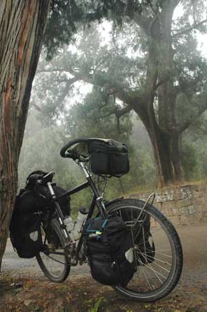 29th November 2005 - km1445 to Foping - 57 km After breakfast (in the owner's bedroom again), we started a very slow and cold climb to the top of the mountains. After 3 hours, we had only rode 18 km, but we were at the top of the road, which was a strangely located tunnel surrounded by pictures of monkeys and pandas. The downhill on the other side was absolutely amazing. We were riding in an entirely different landscape: the forest was mainly made of bamboo, and there were many exotic trees, as well as assorted exotic birds, many we had never seen before.