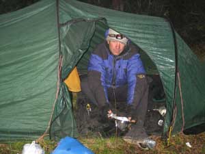 Happy campers - Terry trying to repair his overshoes with some "bodge it" tape