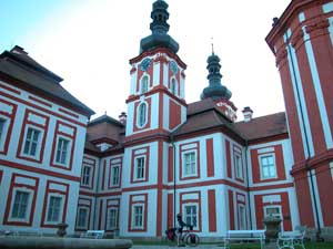 After Tepla, we headed for Manetin where we knew there was a baroque castle. It was there indeed, but we had no time to look at it as a man coming out of a Potraviny shop got chatting with Terry. He did not speak any German or English, but they still manage to talk about skoda and ford cars! It is sometimes amazing what you can say without knowing a language. We manage to find out how far was Kralovice and were ready to go when the Potraviny man somme us to stay. He came back with a beer for Terry and "une orange pour madame" (in his own words!). He was so impressed with our trip that he refused to take a phone call to carry on "talking" to us (his wife was not so pleased though..). So off we went through the strange town of Manetin. The castle seems to have been stuck to the main village road and there are statues lining the roads in and out of the village. Strange town but we did not have much time to spare. We went off to Kralovice and just before reaching our campsite, we had one last piece of wonder in front of us: the cloister of Mariansky-Tynec. All renovated and looking fabulous in the evening sunlight! |
