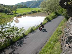 One of our planned stops had been to visit the castle at Pernstein - unfortunately the English teacher told us that there had been a fire in the castle so there were no longer any visits. We visited the area anyway as it allowed us a nice afternoon following a beautiful quiet river valley. The lack of any campsites forced us into a local bar to kill a few hours until dusk began to fall and we could then put the tent up. When wild camping we tend to leave putting the tent up until later to avoid being spotted or causing offence to people. The narrowness of the valley and the large areas of barley and wheat fields made the choice of campsite difficult - in the end we found a patch of rough ground alongside the river amongst some flood debris - never mind, it can't always be the idyllic fairytale camping spot. |
