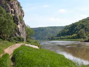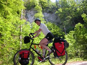 From Tisnov we headed Eastwards towards the Moravian Karst. A large area of limestone landscape with gorges, sink holes, caves, disappearing rivers and steep wooded vallies. The route through the valley to Sloup was closed to all traffic except bicycles so it was a perfect spot to cycle through. The day was sunny and 28 c, so the steep vallies and the cold air from the caves made for a refreshing route. The area had been inhabited by man 12000 years ago and there were all manner of animal remains found within the cave systems including mammoth, lions and a hairy rhinoceros (?) One strange point regarding the 1:100,000 Czech maps is the indication of "Notable Trees". These are marked with great frequency on the map but are impossible to find in real life - unless the stunted, little apple tree hides a story and life far more "Notable" than it's mere appearance shows. We camped that evening in Plumlov, a small town on which we were once again the only persons in tents. The remainder of people were staying in the small bungalow/cottages around the periphery of the campsite. |