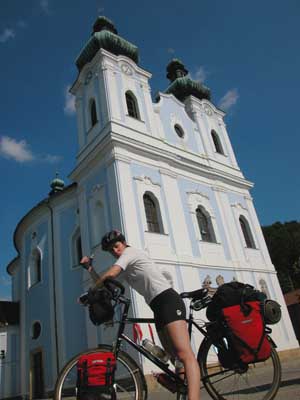 2nd June 2005 - Zd'ar to Tisnov - 68 km In the morning we visited Zd'ar to see the UNESCO heritage monument - Pilgrimage Church on the Green Hill. This is a wonderful 17th century church built designed by a Czech architect called Santini (maybe a bit Italian too). The whole church is surrounded by a 10 sided (decahederal) cloister full of all sorts of imagery and symbols. The church is based around a five sided star, with five doors and, five chapels and a variety of designs of windows to satisfy the needs of the various benefactors. The church is based on the theme of St Jan (St Jean Bouche d'Or in French) and his famous tongue - he could be trusted with secrets - so much so that he was drowned in reward for his discretion. To celebrate his sacrifice the church is dedicated to him and the ceiling has an enormous tongue painted upon it - the windows above the chapels were also designed to resemble tongues. Apparently Gene Simmons from Kiss will be having a similar memorial made for him when he is drowned.