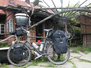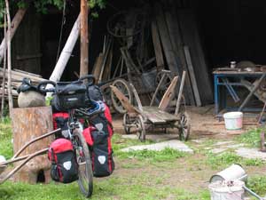 10th June 2005 - somewhere in the woods to Raztoky in Slovakia - 42 km "Rain drops keep falling on my head!" The first impression of Slovakia was a wet one and a hilly one. We were now in the mountains (highest point of the trip so far with 876 m) and we started to cross typical villages made entirely of wood. The Slovak border passage was painless: Isa actually went through without showing her passport. The custom officer could not be bothered to wait for her to find her passport under the many layers of waterproof and warm clothing she was wearing. We reached Raztoky absolutely soaking wet, but we were welcomed there by another friend, Joseph, and his daughter Ivana. |