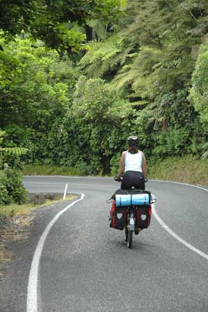 New Zealand has been really quiet and easy compared to China. Here is an example of the type of things that happens to us now. In the morning, Isa was waiting for Terry on a car park space. She was too lazy to make it onto the pavement and was cleaning her sunglasses. She heard a light bipping, turned around and saw a woman waiting to park her car. So Isa moved to the pavement and carried on cleaning her sunglasses, thinking no more of it. The woman came right up to her and... apologised... for not having bipped. "It was the car behind me, I am sorry, really, I would not have bipped at you". Hey??? This is a bit far too civilised for us after more than two months spent cycling in the midst of the vicious Chinese lorry drivers. 18th January 2006 - Hahei beach to Whangamata - 75 km Up and down, up and down, and again would summarise the day nicely. The views were not so outstanding because we mainly crossed a logging area. We only saw the Pacific again when we arrived in Whangamata, famous for its surfing beach, but we did not get a chance to try it. We left the busy camping sites behind (it is the holiday season here) and headed for a quiet site in the bush. |
