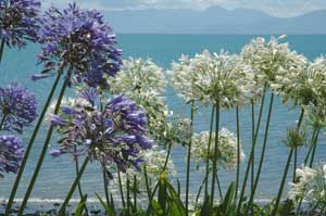 The Firth of Thames with the popular "big flowers" that have been planted in peoples gardens and seem to readily escape into the surrounding countryside - the Agapanthus soon to be banned as a "BioSecurity Risk" |