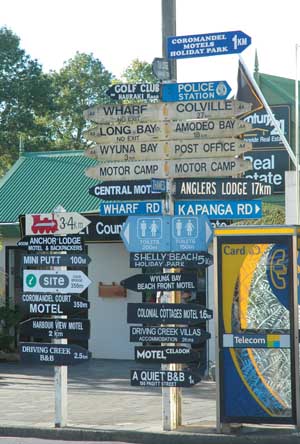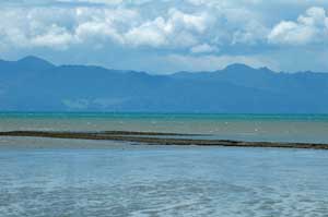 13th January 2006 - Kawakawa bay to Thames - 83 km After more rolly green hills, we followed the coastal road to Thames. The beaches are awesome and they are actually growing because of the huge amount of shells being deposited. The cheniers thus formed fill up thanks to the Mangrove, which has become Terry's favourite tree since our visit to Miranda bird watching centre (see our flora and fauna report). We spent the night in Thames, which is the biggest town we have seen since leaving Auckland. 10,000 inhabitants, but where are they all? It is such a quiet little town. Maybe they are down in some mines, still looking for gold, which abounded in the area last century. |