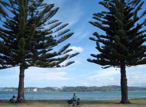 15th January 2006 - Coromandel Town to Whitianga - 50 km Poor legs!!! The day started with a nasty 400m, 12% climb, which put off some of our fellow cyclotourists. We thought we were up for it, but we did not expect the next three steep hills. One of them was 18% steep for a section of 100m. Nothing else to do but curse and slowly push on. But the beaches on the Pacific side of the Coromandel peninsula were well worth it. White sand, superb blue sea. We added a note of colour with our bright red noses despite three applications of our factor 35 suntan cream. We stopped for the evening in Whitianga, which has a fabulous beach. Plenty has happened here: it is said that it is in this bay that the first Polynesian explorer, Kupe, has landed. The bay is also called Mercury bay because captain Cook stopped here to do some astronomical observations (of the planet Mercury as it happened). |