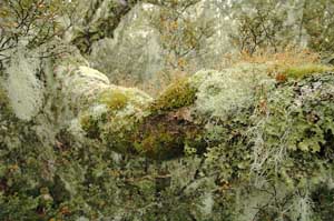 Lichens and mosses on the trees surrounding the hot bubbling mud pools