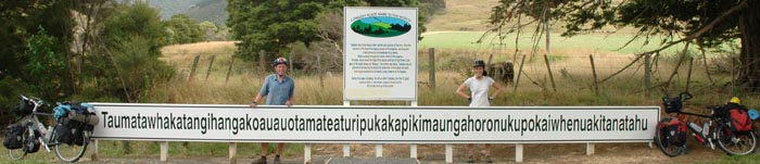 2nd February 2006 - Blackhead beach to Weber - 72 km More sheep, more hills, more fences. We are now noticing serious signs of erosion and eutrophisation in the rivers and ponds. It is such a great change from the pristine water of the rivers around lake Waikaremoana. Two things stood out in the sheep country. The beautiful beach of Porangahau and the hill which has the longest place name in the world. We have counted 85 letters but may have missed one or two - see below! |