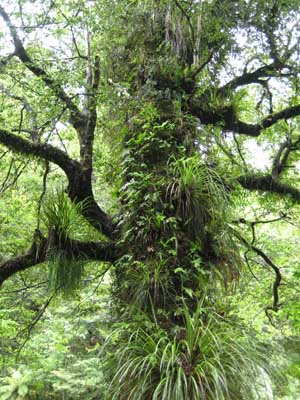 25th January 2006 - Murrapara to Taupeupe Saddle - 66 km Mostly off road for another rollercoster of a drive on gravel roads. But the lack of cars and the fantastic native rainforest (or bush) made up for the effort. Another record was beaten that day: 1469 meters were climbed to the greatest joy of Terry! The bush was fantastic. As soon as we entered Te Urewera national park, the forest was everywhere, on every slope. No room for grass here. Giant ferns, all types of podocarps (trees that grow in only a few parts of the Southern Hemisphere) and beeches are thriving. Most of the trees are new to us and named in Maori, so we really struggle to remember what they are. Strong rain started falling towards the end of the afternoon and we stopped under a concrete shelter on top of the last pass for a very wet night amongst the graffiti and spiders. |