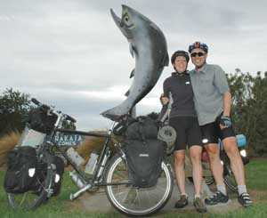28th February 2006 - Christchurch to Rakaia - 75 km Unfortunately, the wind that made us reach speed records before reaching Christchurch decided to start blowing again. And this time it it did not work in our favour! It took a few coffee and cake stops to keep us going on this dead flat road! We made it to Rakaia, Salmon fly fishing capital of NZ. Unfortunately this summer was far too hot and dry for the salmon - they are spending their time in the cooler more refreshing waters of the pacific - very unfortunate for the 500 senior fisherman who were at the campsite for the annual salmon fishing competition. |