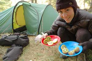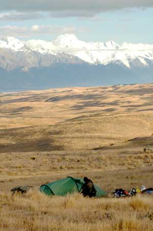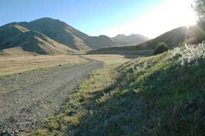 2nd March 2006 - Geraldine to Burkes Pass Village - 74 km Finally, the wind eased off and as we got closer to the mountains, the road started getting a bit more interesting, despite the many buses shifting jet-lagged tourists from Christchurch to Queenstown. The day finished with us finding an unlocked gate and a great wild camping spot amongst a lovely pine forest. |