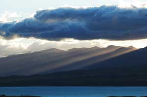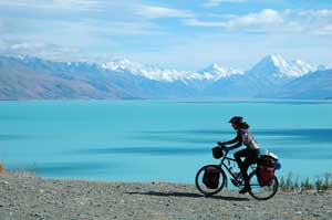 3rd March 2006 - Burkes Pass Village to Lake Pukaki- 53 km Another easy cycling day turned rather painful because of the strong Southerly winds! All day we struggled, through the flat McKenzie basin and along the canal road that links lake Tekapo to lake Pukaki. To compensate for the pain, we had fabulous views of both lakes. The sun turned them turquoise blue and in the background the snowcapped Mt Cook range was dominated the landscape. We planned to cycle all the way to Lake Pukaki but eventually gave in to the fierce headwind and found a spot to wild camp overlooking the lake and the Mount Cook range.