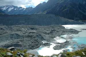 5th/6th March 2006 - Mount Cook On our first day, we attempted to ride up the 22 km to Mt Cook village but the vicious West wind scared Isa: she did not like being pushed into the middle of the road or swerving in front of the too fast, too frequent tourist buses. We turned around and came back to our campsite in Glentanner, feeling like a couple of lightweights. At least on the return journey we only got blown off the road! On the second day, we took a bus and finally got up close with some glaciers (the Hooker and Moeller glaciers more specifically). Due to the rapid retreat of the glaciers the terminal areas are quite desolate to look at - all rocks and grey water. Due to the perceived danger in the area there are only 4 or 5 short walks to do around Mount Cook village so it wasn't possible to get any closer to the glaciers - unless by helicopter, plane or a $1250 guided route! So it's back on the bikes then. Mount Cook dominates the whole valley by its sheer size. So Terry was amused to hear an American tourist saying: "Mt Cook is soooo small, the Rockies are way bigger". Yankees always seem to do it bigger and better! |