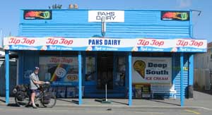 21st February 2006 - Springfield to Christchurch - 72 km The sun was shining and the wind was for once blowing in the right direction! This was going to be a fast day and a flat one too, so we took our time to leave Springfield and went to meet Mel and Val in their cottage. We had a longer chat than expected with this lovely couple, who enjoyed picking up cyclotourists by the side of the road and inviting them for tea! There is not much going on in Springfield and this is their way of socialising. And a rather pleasant way too: we ended up staying for lunch and being offered home made jam! |