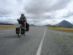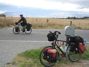 1st March 2006 - Rakaia to Geraldine - 86 km We thought the wind was bad yesterday, but in the morning strong gales started blowing. They were blowing from the North-West and making us swerve all over the road. A lady we met expained that it was a "Nor Wester" and "That's what Canterbury is famous for". We met a friendly farmer, who summarised in half an hour the water problems of the Canterbury plain, the globalisation of New Zealand farming, the history of the area and the weather conditions. As for the weather, he told us that the clouds forming ahead announced a Southerly (wind) was on the way. At present, we were still fighting against the Northwesterly. At the end of the afternoon, there would be one minute of calm and then the wind would suddenly start blowing from the South. Hearing this, we tried to reach as fast as possible the only turn of the day, which was a turn to the South. Unfortunately, the weather was as quick as us and we soon were struggling against Southerly headwind. Raaaah!!! And with the Southerly came the bad weather from the Antarctic and we ended up the day in cold wet rain! |