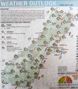 (left) The weather forecast from the local paper - all red arrows - red to represent the colour of a cyclists face as they battle into the 80km/hr headwinds Please follow the link for our next page - Dunedin via the Otago Central Rail Trail |