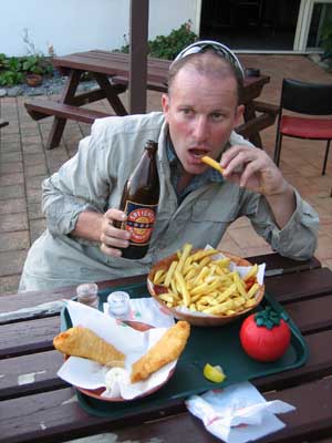 Speight's beer and fish and chips - a nourishing high energy meal as recommended in Lance Armstrong's latest training manual