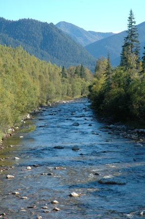 (left)A siberian river and beautiful mountain backdrop