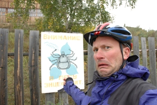 We stopped at a cafe to warm our bones and carried on to Slioudanka. This is such an ugly town with collection of non-smiling people. Maybe it was the cold weather, but it makes no sense to us as it is set in the most beautiful location imaginable: by lake Baikal and at the start of the Circumbaikal railway line, surrounded by steep mountanis and beautiful autumn forests. Clearly the town has not taken advantage of these features. So we pedalled away to find a camping spot in the forest again. We were not bothered by mosquitos from that day onwards, as they had been killed off by the cold, but we they were by tiny biting tiny flies. These flies looked innocent but would swarm around and jump into your nostrils, eyes and mouth - quite irritating. Terry then discovered that when they bite they draw blood. That night we lit our first fire - it kept us warm and kept the little blighters away.