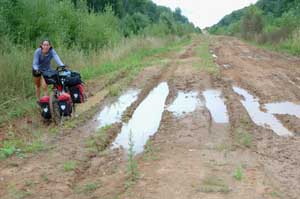 After 3 km of hard cycling in the mud and deep puddles and One and a half hours later, we reached another small wooden village. A man came to meet us and when we showed our map, he said that the road was old and not accessible anymore but there was a way of crossing the oblast at the end of the main road. Back to square one and 3 more kilometers of cycling in very deep mud and another 1 1/2 hours. The mud was thick and blocked up the wheels such that they refused to turn - we were not happy bunnies. By that time the mosquitoes were feeling very hungry and the legs were very tired.