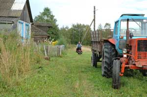 We left Vologda rather late after updating the internet and collecting our emails; the usual computer faff. The day was breezy and sunny, the road heading South of Vologda was lovely. After 40 km riding ahead, Terry finally stopped and Isa caught him up. Terry pointed towards a very muddy track leading to a small village off the main road and said this is our turn. Hum.... Terry had decided to put the local map purchased in Vologda to the test: we were going to follow the small tracks that were indicated crossing the oblast (or district) border.