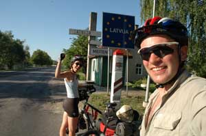 11 Juillet - de Kairiai à Eleja en Lettonie - 90Km. Le passage de la frontière a été facile. Nous sommes seulement sortis de Lituanie (drôle...il n'y a pas eu de contrôle de passeports) et il y a eu un contrôle rapide du coté letton. Il n'y avait pas de services des deux côtés, sauf des toilettes pour dames, qui, très amicalement ont accepté de changer notre argent Lituanien en devises Lettonnes. Croyez le ou pas, Isa est sortie avec de l'argent lituanien (mais avec 20 litos en moins) sans s'en apercevoir. Notre première arnaque, mais pas trop mauvaise, merci beaucoup ! Nous nous en sommes aperçu lorsque nous avons voulu acheter un peu de nourriture pour le soir et que notre argent a été refusé. Il était tard dans la soirée en Lettonie, Nous étions sans argent et sans moyen de nous en procurer ! |
