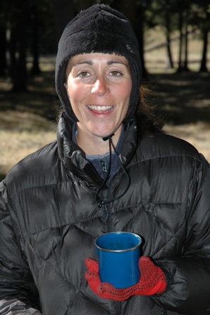 Ce jour requière une mention spéciale. Nous campons sur une colline et la température est devenue durant la nuit extrêmement froide. Avec l'humidité du fleuve en dessous, nous nous sommes réveillés avec une tente totalement givrée ainsi que nos vélos, mais ce qu'Isa a vraiment détesté c'était que le chapeau qu'elle a porté pendant la nuit était totalement gelé. Toute la glace est tombée dans son cou, pas une manière plaisante de se réveiller ! À 8 heures, il y avait - 4°C . Il a fallut beaucoup de tasses de thé pour se réchauffer les doigts.
