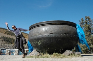 Après le marché, nous avons décidé d'aller voir la grande statue de Bouddha sur la colline locale. Nous avons été bientôt entourés par vingt écoliers disant tous « bonjour, mon nom est… » un après l'autre. À notre honte, nous étions incapables de prononcer n'importe lequel de leurs noms et quand nous avons essayé, nous avons été salués par des hurlements énormes de rire. Après quoi la conversation a été plutôt limitée et leur professeur nous a dit qu'ils savaient seulement compter jusqu'à dix. Mais ils n'étaient pas timides de toute façon et nous avons eu un grand travail pour les empêcher de sauter sur les vélos et de partir au loin. Pendant qu'une autre vague d'écoliers approchait (nous avions dit bonjour quarante fois depuis), nous avons décidé qu'il était temps de penser à notre déjeuner. Nous avons trouvé un emplacement tranquille un peu plus loin. Mais juste pendant que nous nous asseyions , un homme est venu et nous a interrogés au sujet de notre voyage. Il parlait russe ainsi un peu de conversation était possible. Il s'est simplement assis avec nous tandis que nous mangions et est parti poliment quand sa cigarette a été finie. Un autre homme est alors venu, nous posant les questions habituelles. Et quand nous devions partir, nous avons eu un troisième visiteur, cette fois de dix-neuf ans sur un vieux vélo de course Bianchi. Il nous a demandé s'il pouvait nous suivre tandis que nous roulions. Ainsi nous avons eu une escorte les 15 kilomètres suivants. Ce gars était si intéressée par nos vélos que nous avons pensé qu'il allait se brûler les yeux en les regardant trop. Nous avons échangé nos vélos pendant un moment, mais nous ne pensons pas qu'il ait été trop impressionné par la lenteur et le poids de nos vélos de tourisme, il a semblé tout à fait heureux de reprendre son vélo de course léger à Dachan.