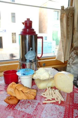 Un choix des produits mongols typiques tous prêts pour notre voyage en train. Il y a : le beurre, le yaourt, le fromage sec doux tressé, le fromage frais, le fromage de grand magasin d'état (miam), les biscuits frits et le dernier favori d'Isa - le flacon thermos de 3 litres.
