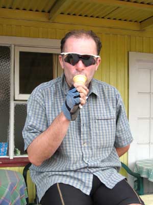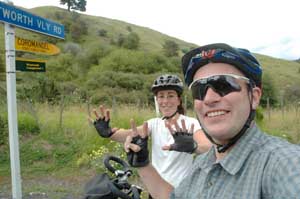 19 Janvier 2006 - de Whangamata à Katikati - 73 Km. Une autre grande montée dès le départ pour réchauffer nos jambes. Mais la pluie nous a rattrapé à Waihi. Nous avons juste eu le temps d'atteindre un café et échapper à la douche. Nous sommes parvenus à passer 2 heures et demi en mangeant des sandwichs et en buvant des bols énormes de café, avant de manquer de choses à faire, manger et parler. Heureusement la pluie s'est arrêtée peu de temps après et nous sommes retournés sur les vélos.