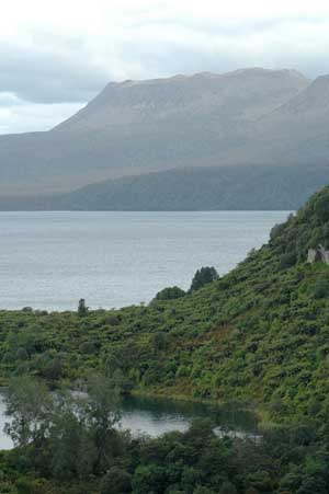 La pluie s'est arrêtée pendant le voyage vers Napier. Vue sur le lac Waikaremoana et Panekiri Bluff.