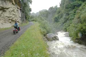 Routes de graviers, des chutes d'eau et de la pluie sur la descente vers le lac Waikaremoana. 25 Janvier 2006 - de Murrapara à Taupeupe Saddle - 66 Km. La plupart du temps la route ressemble à des montagnes russes sur un revêtement de graviers. Mais l'absence de voitures et la forêt tropicale indigène fantastique (le bush) a compensé l'effort. On a battu un autre record ce jour : 1469 mètres ont été montés pour la plus grande joie de Terry ! Le bush était fantastique. Dès que nous sommes entrés dans le parc national de Te Urewera, la forêt était de partout, sur chaque pente. Pas de place pour l'herbe ici. Les fougères géantes, tous les types de podocarps (arbres qui se développent dans seulement quelques parties de l'hémisphère sud) et les hêtres prospèrent. La plupart des arbres sont nouveaux pour nous et sont nommés en maori, ainsi nous faisons vraiment des efforts pour nous rappeler leur nom. Une forte pluie a commencé à tomber à partir de la fin de l'après-midi, nous nous sommes arrêtés sous un abri en béton au sommet du dernier col pour une nuit humide parmi les graffitis et les araignées.
