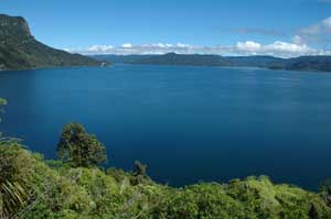 26 Janvier 2006 - de Taupeupe Saddle au Lac Waikaremoana- 101 Km. C'était ensuite tout en descente jusqu'au bijou du parc, le lac Waikaremoana. Malheureusement, la pluie n'avait pas arrêté de toute la nuit et semblait installée pour toute la journée. Nous avons atteint le lac absolument trempés et avons cherché refuge dans une petite cabane près du lac. Toutes nos affaires nécessitaient un séchage . La pluie et le vent combinés étaient si mauvais que certains de nos sacs Ortlieb commençaient à prendre l'eau ! 27 Janvier 2006 - Le lac Waikaremoana. Nous avons décidé qu'un jour au sec ne serait pas un luxe avant de partir au loin sur d'autres routes de gravier. Nous avons utilisé ce jour là pour visiter un autre lac proche, le lac Waikareiti. La promenade dans le bush était impressionnante et l'eau du lac absolument pure. Il y a quelques îles ou sont totalement libres et sauvages des rats des "soats" et des opossums au milieu du lac, c'est aussi un asile pour plusieurs espèces menacées d'oiseaux néo-zélandais. Les opossums ont été introduits d'Australie vers la Nouvelle Zélande pour le commerce de la fourrure. Depuis ils se sont échappés et on estime qu'il y en a maintenant 70 millions errant en Nouvelle Zélande. Ils mangent le bush indigène et gagnent la compétition pour la nourriture avec l'avifaune endémique telle que le kiwi. Le DOC. encourage leur destruction avec des pièges à opossum ; et la vente de fourrure d'opossum pour $75 par kilo. Étonnamment en Australie l'opossum est menacé et est une espèces protégée.