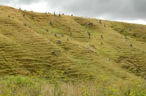 Plus de moutons, plus de collines, plus de barrières. Nous notons maintenant les signes sérieux de l'érosion et de l'eutrophisation dans les fleuves et les étangs. C'est un grand changement de l'eau primitive des fleuves autour du lac Waikaremoana. Mais nous avons vu deux choses dans le pays des moutons. La belle plage de Porangahau et la colline qui a le nom de lieu plus long dans le monde. Nous avons compté 85 lettres mais avons pu en avoir manqué une ou deux !