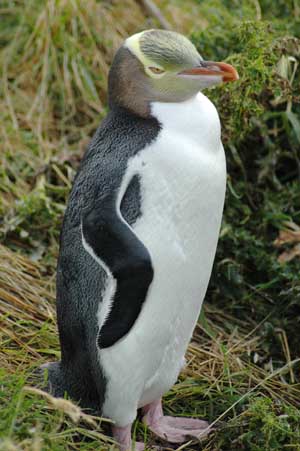 Un pingouin aux yeux jaunes, maintenant très rare en raison de la perte de son habitat et de l'emprise des prédateurs. Le troisième plus grand pingouin est timide et vit dans la région boisée et parmi les arbustes le long de la côte.