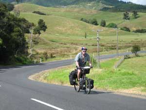 14 Janvier 2006 - de Thames à Coromandel - 62 Km. Nous avons fait une visite rapide du marché de Thames samedi et sommes parvenus à ne pas trop nous charger. Isa a investi dans un sarong pour couvrir son collant de vélo et un choix d'épices ce qui signifie que notre cuisine de camping devrait être un peu plus variée. La route de Thames à la ville de Coromandel a suivi la côte pendant 40 Km nous fournissant des vues merveilleuses de Firth of Thames et des montagnes découpées de la péninsule de Coromandel. La route a alors plongé à l'intérieur des terres et nous avons commencé à affronter les premières côtes. À la différence de la Chine ou les pentes des routes sont tracées pour s'adapter aux camions surchargés et s'élèvent graduellement - ici les routes vont directement vers le haut - avec des pentes de 8% à 16%. Ce qui nous promet des ascensions difficiles et douloureuses. Nous avons été récompensés par de grandes vues sur les îles, les montagnes et les plages éloignées, avant d'entreprendre une descente existante vers le bas de la colline. Nous avons campé ce soir là juste au nord de de ville de Coromandel - avec 4 autres cyclotouristes - HansPeter et Ursula de Suisse (nous nous étions précédemment vus à Auckland) et Axel et Brigit en voyage de noce depuis l'Allemagne.