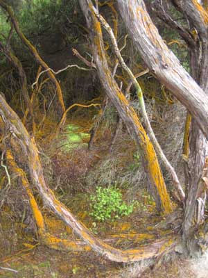 Les explorateurs intrépides pénétrant profondément dans la forêt tropicale inexplorée, sur un sentier familial facile d'une heure jusqu'au lac Waikareiti. 28 Janvier 2006 - du Lac Waikaremoana à Waihua - 90Km. De retour sur nos vélos, mais cette fois au soleil et avec quelques sucettes offertes par la dame du terrain de camping pour nous aider à franchir la grande colline. Elle doit avoir voulu dire des « collines » parce que quoique la journée ait été la plupart du temps en descente, nous avons eu beaucoup de montées. Les néo-zélandais ne savent pas la signification de plat. Quand ils disent « onduler », ils veulent dire que : « une longue série de collines courtes et raides tuera vos jambes et écrasera votre esprit ». Quoi qu'il en soit, nous avons pu finalement voir le lac Waikaremoana dans toute sa splendeur. Dès que nous avons atteint la frontière du parc national, le bush indigène a disparu tout à fait d'une façon dramatique, cédant la place à des prés à moutons et a des champs ou a des forêts plantées, qui sont tout à fait ennuyeuses en comparaison de la folie du bush indigène.