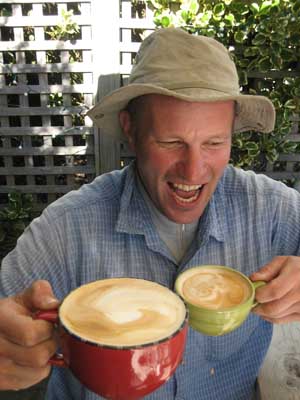 16 Janvier 2006 - Nous essayons de nous reposer à Whitianga. Puisqu'il n'y avait aucune structure élevée (cathédrale, tour ou autre) à gravir, Terry a décidé de passer notre jour de repos en faisant un peu de kayak de mer. C'était sans compter avec le vent violent qui a commencé à souffler à partir de la côte dans notre dos. Nous sommes revenus sur la plage de Whitianga après avoir beaucoup lutté. Pour une fois que ce n'était pas nos jambes qui soufraient !